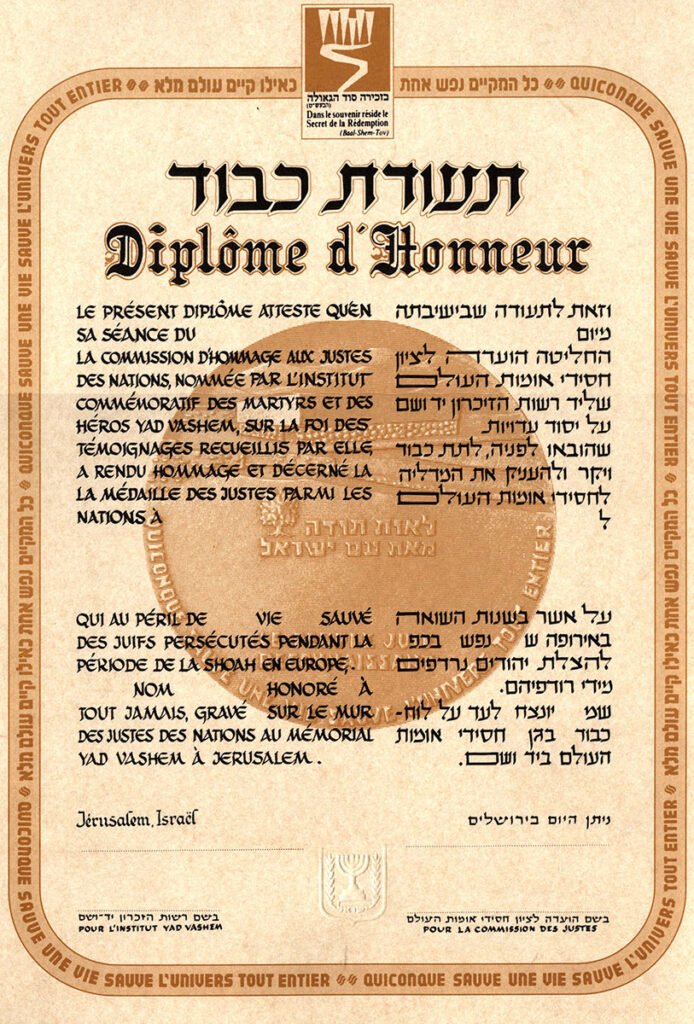 Yad Vashem, l’Institut International pour la Mémoire de la Shoah a été créé en 1953 et instauré dix ans plus tard, le département, unique au monde de ‘Justes parmi les Nations’ pour que leurs noms soient inscrits pour l’éternité dans la pierre de Jérusalem.